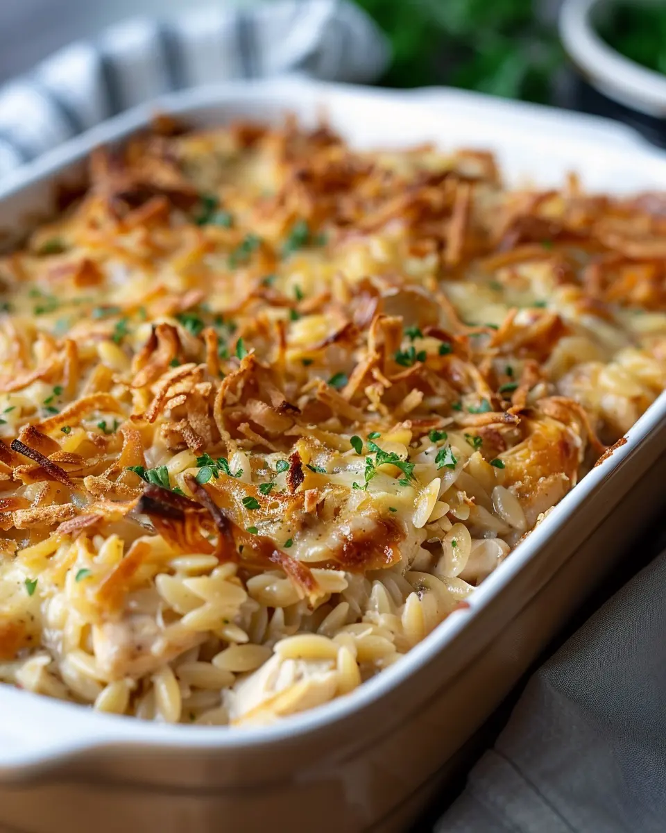 A delightful casserole combining the flavors of French onion soup with tender chicken and orzo pasta.
