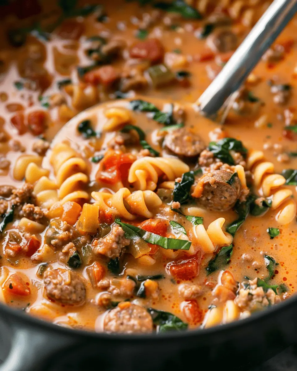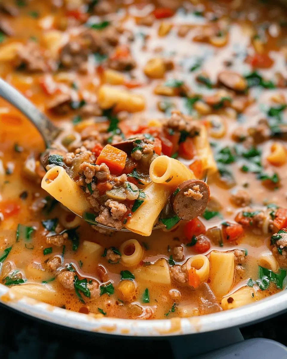 A warm and filling soup perfect for any occasion, bursting with flavors from Italian sausage and pasta.