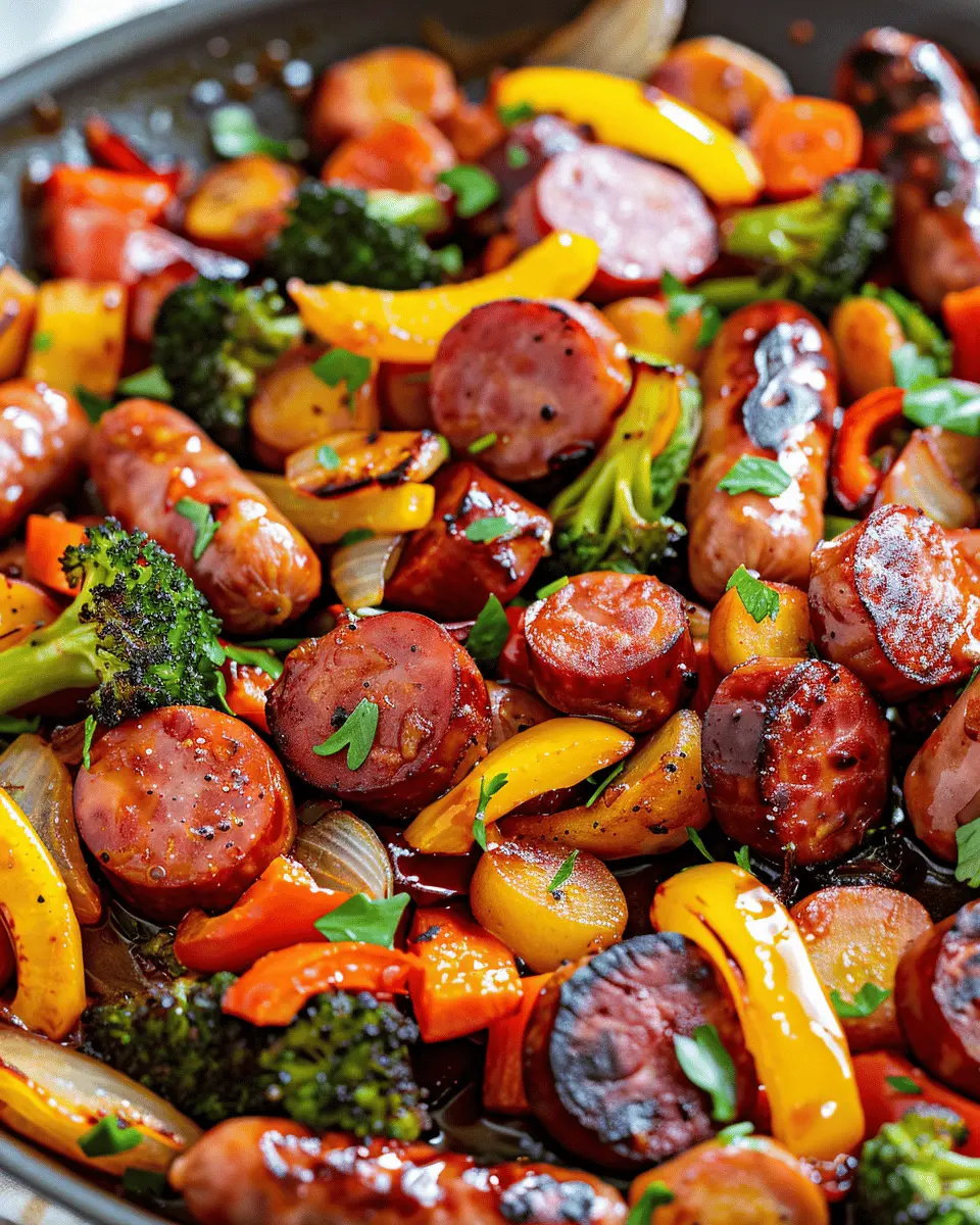 A delightful and simple recipe for a weeknight dinner featuring honey garlic kielbasa and fresh vegetables, all made in one pan.