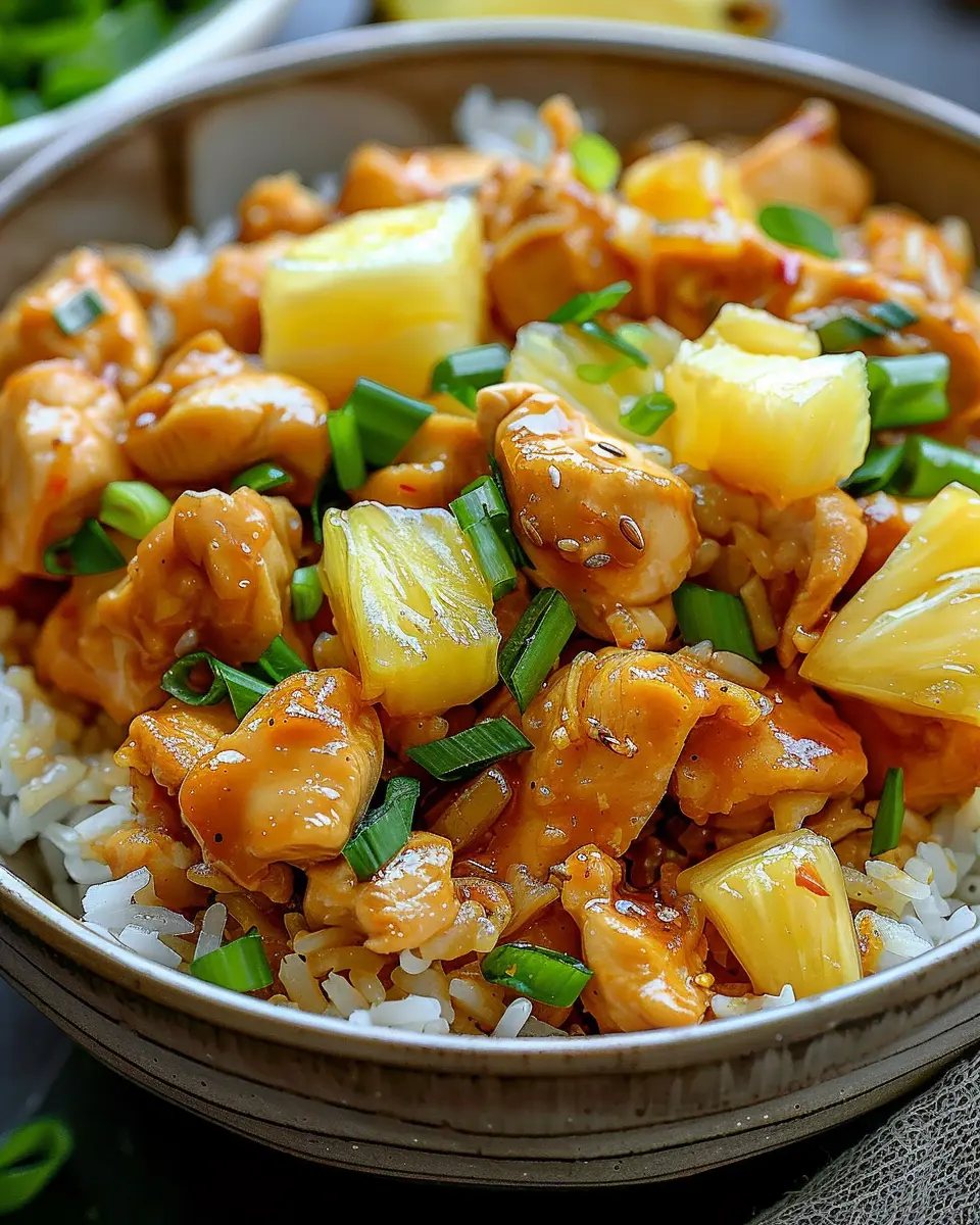 A delightful and tangy dish that combines tender chicken with sweet pineapple and fluffy rice.